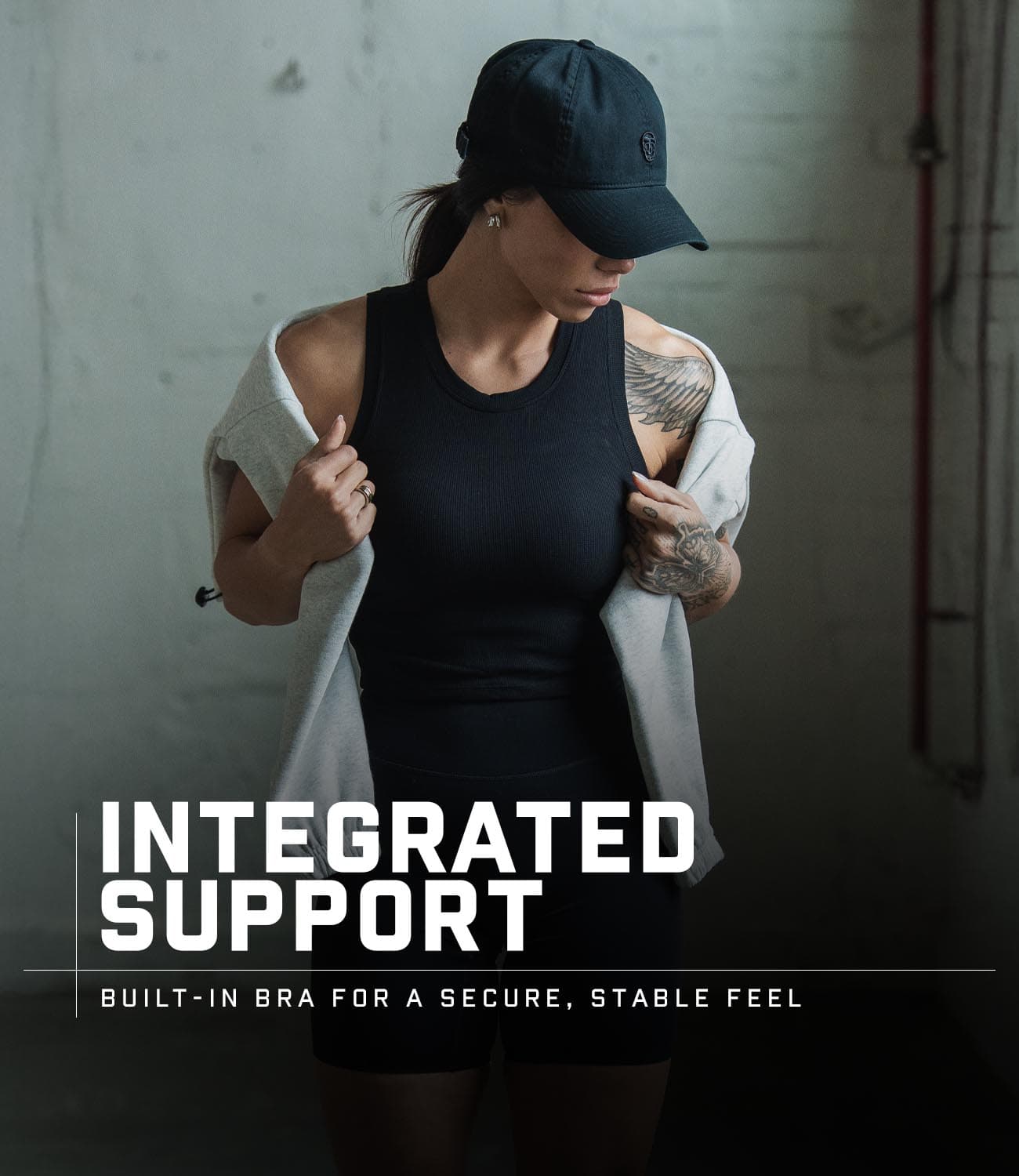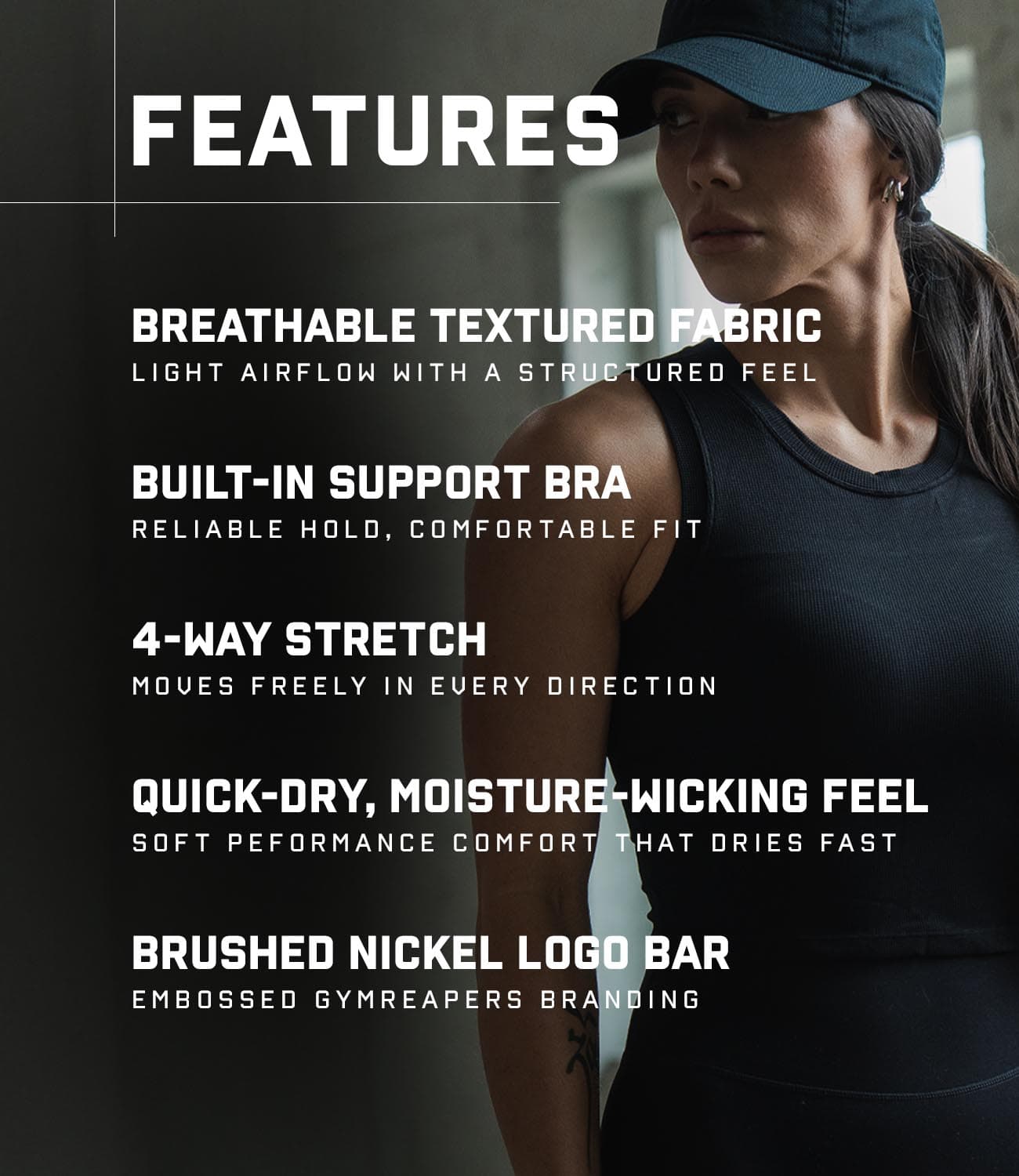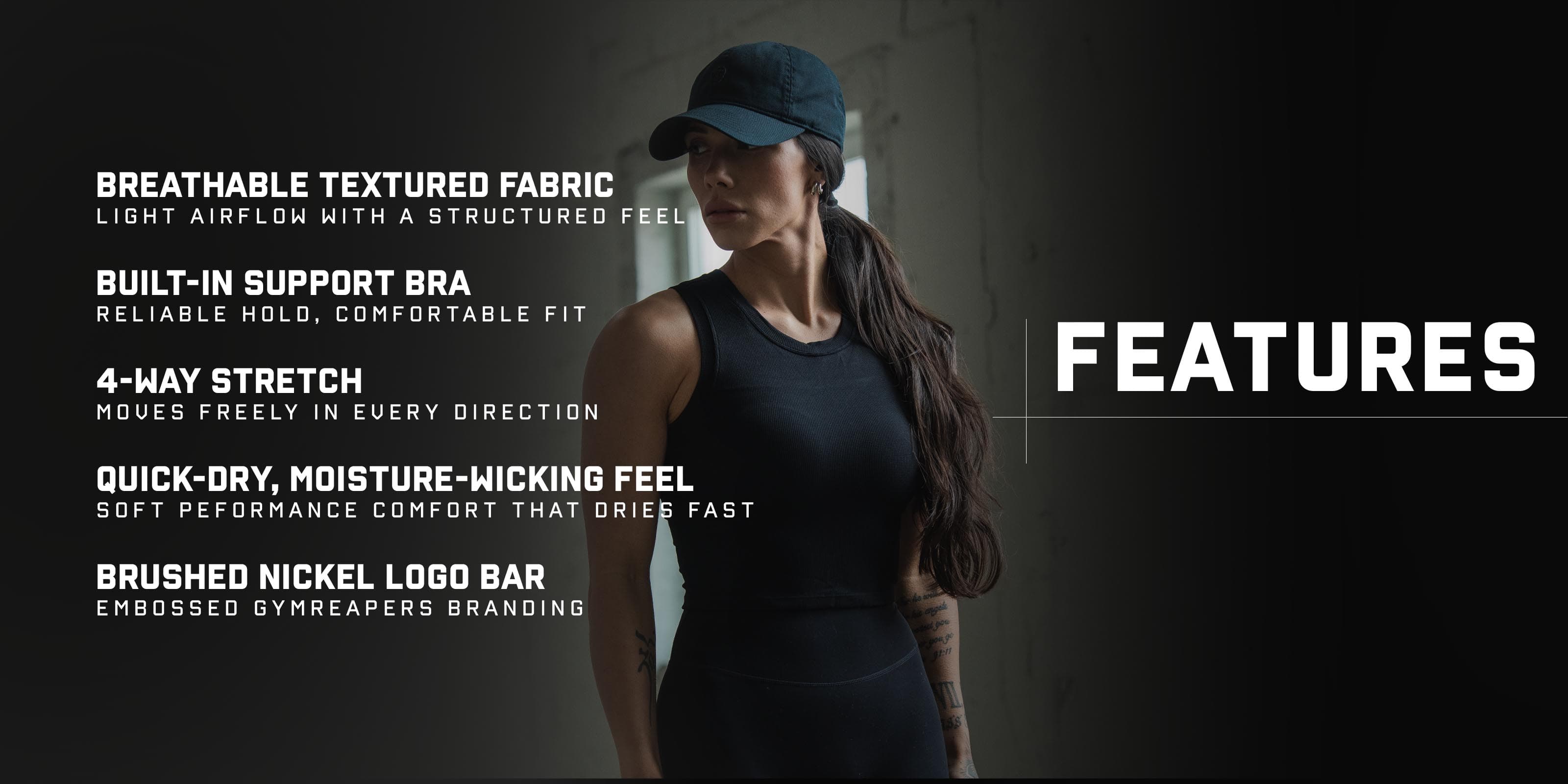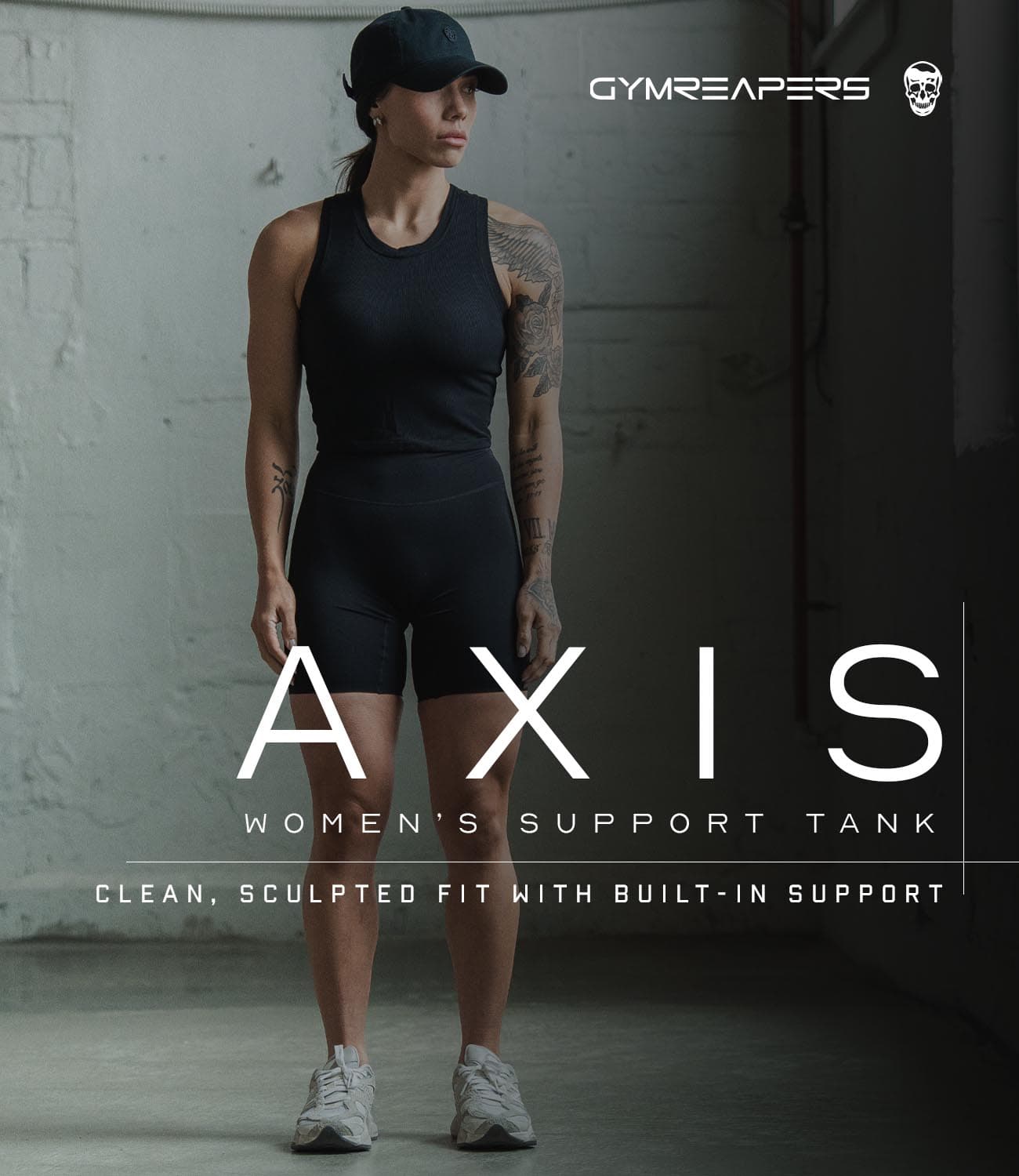 Minimal yet refined, the Support Tank is finished with a brushed nickel logo bar embossed with the Gymreapers emblem, creating a balance of performance engineering and elevated design.