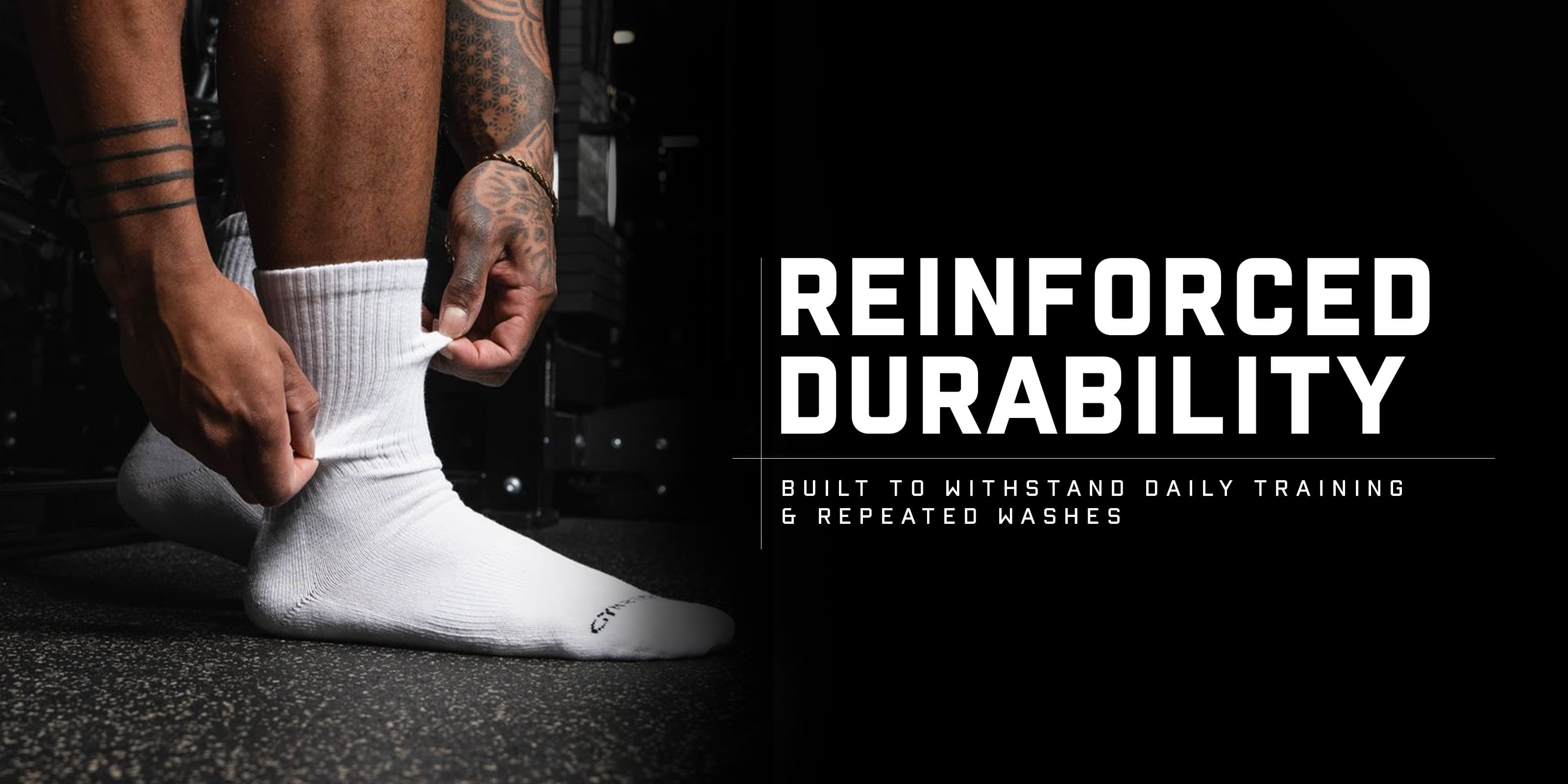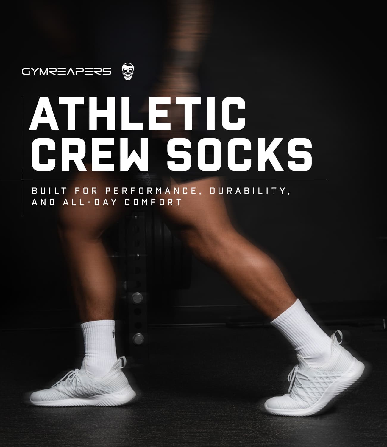 The Gymreapers Crew Length Socks provide comfort and support to your workout with extra cushioning under the heel and toe and a ribbed, no-slide arch band.