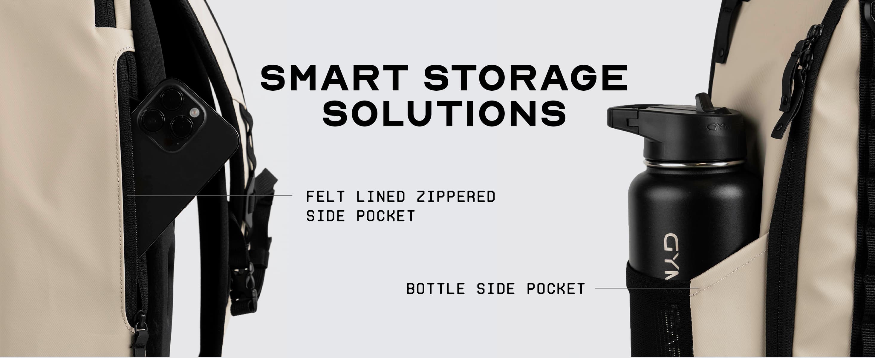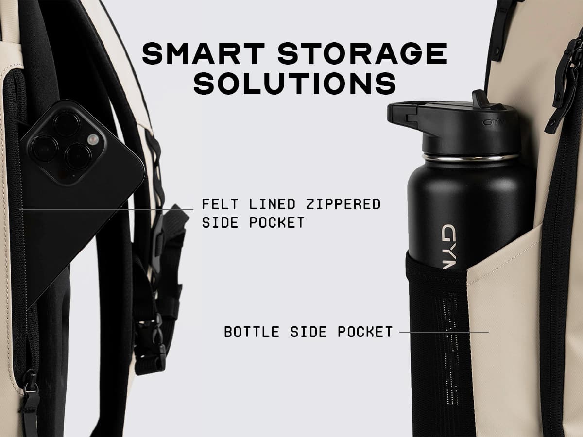 - Side pocket to fit most water bottles up to 32 oz (946ml)