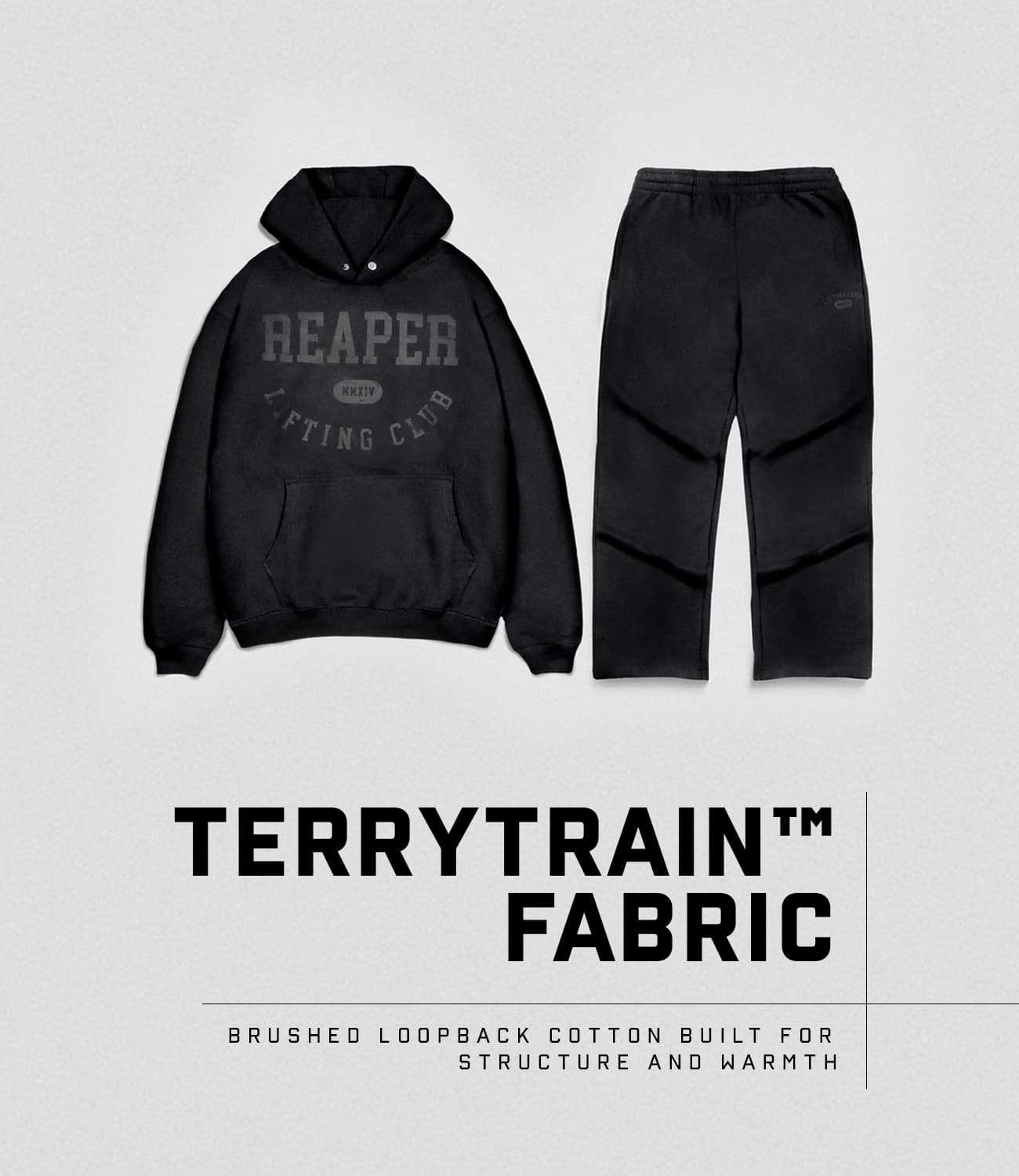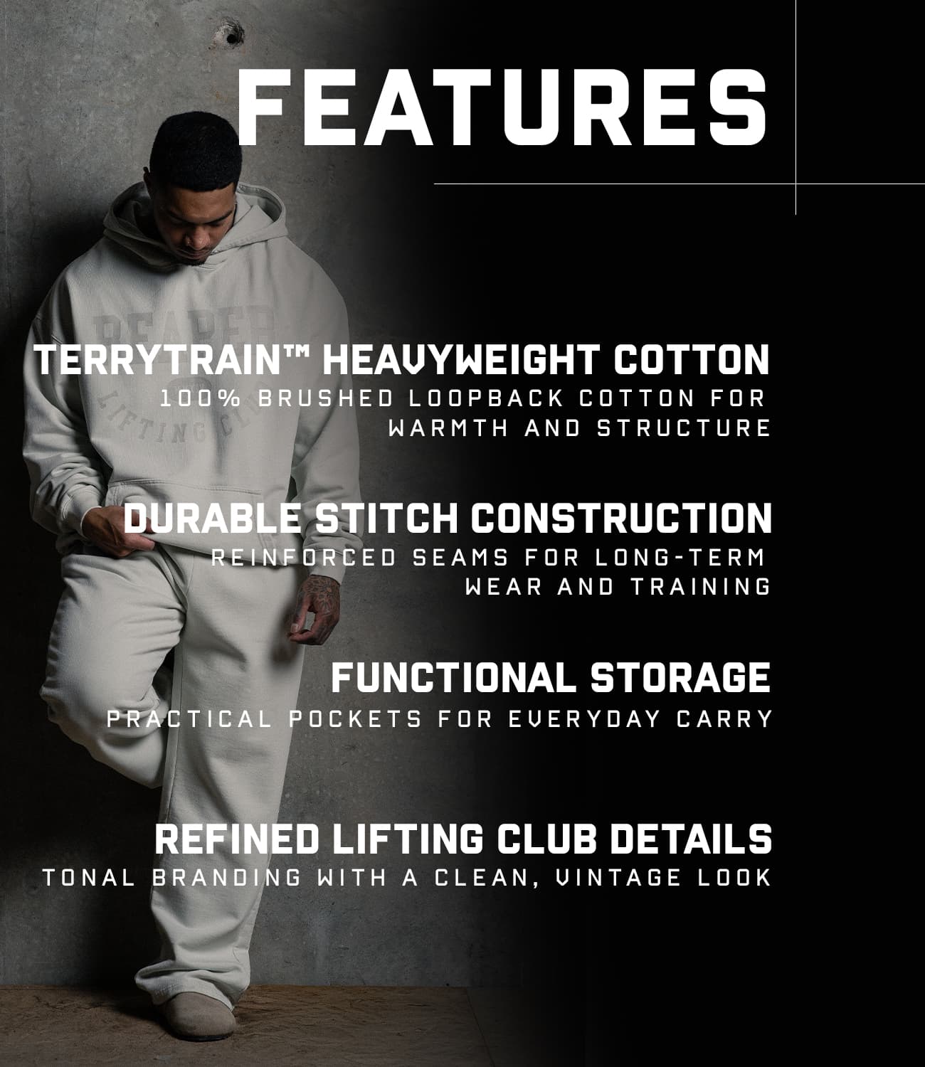 The Vintage Warm-up Set was designed to deliver structured comfort, everyday durability, and a clean athletic aesthetic. Built with our signature TerryTrain™ heavyweight cotton, both the hoodie and jogger feature a soft brushed loopback interior, smooth exterior finish, and an antibacterial treatment to help maintain freshness through repeated wear. With tonal Lifting Club graphics and functional details throughout, this set brings a modern, relaxed look to warmups, cooldowns, and daily wear.